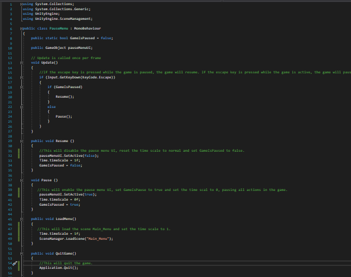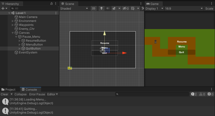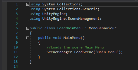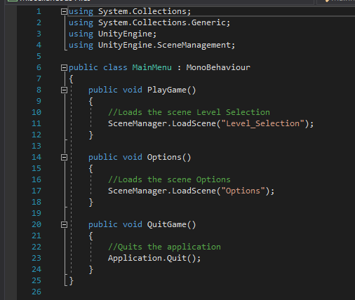 After testing the menu navigation, I found that I hadn’t written a new script that allows the player to return to the main menu. If the exit button was used, it would close the game instead of returning to the main menu.
