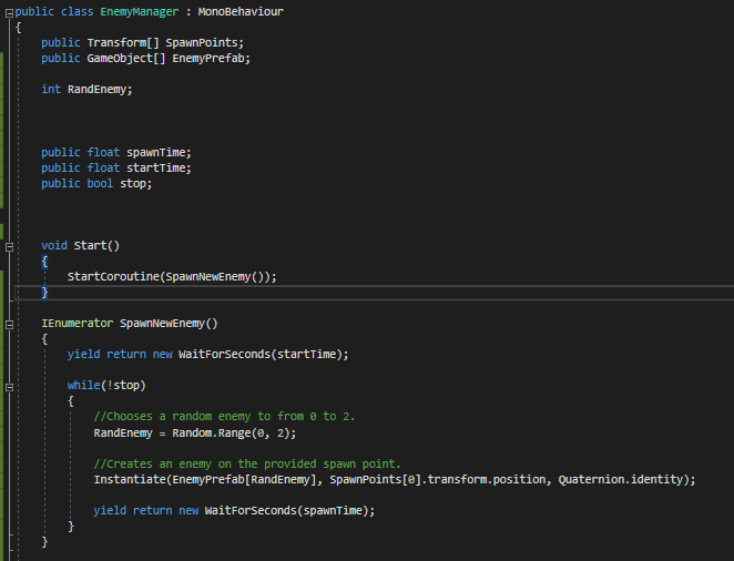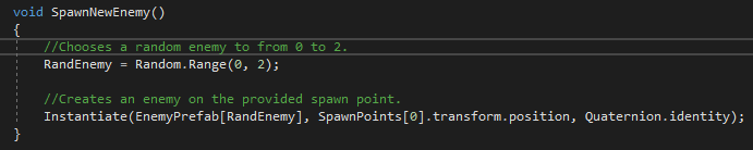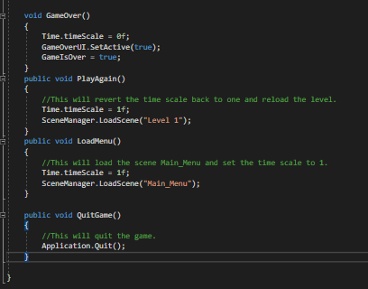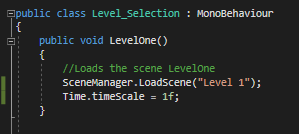 When game over is reached and the player starts the level again from the level selection menu, enemies wouldn’t spawn. I found that the issue was the time scale still being set to 0. To fix the, I made the level loading script set the time scale to 1 when the level is loaded.