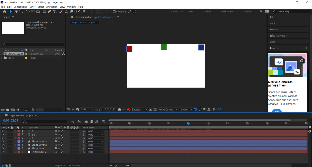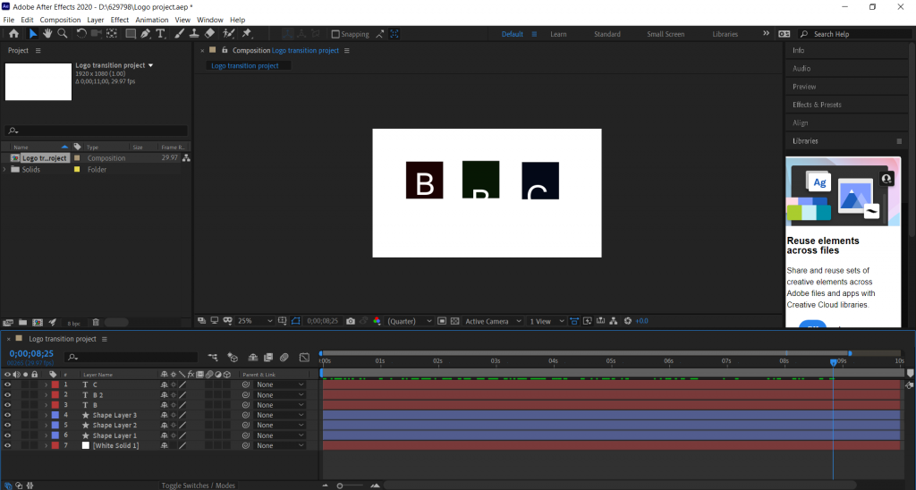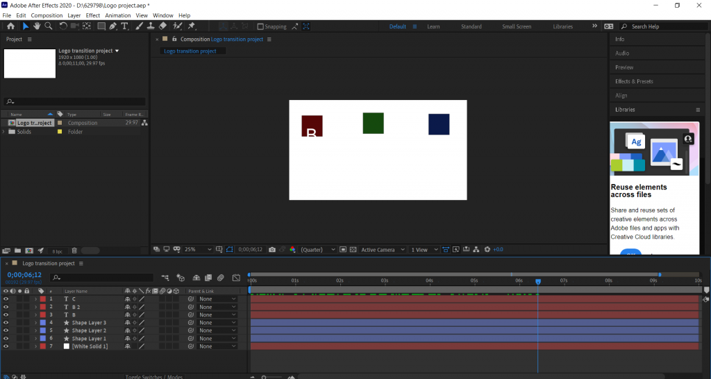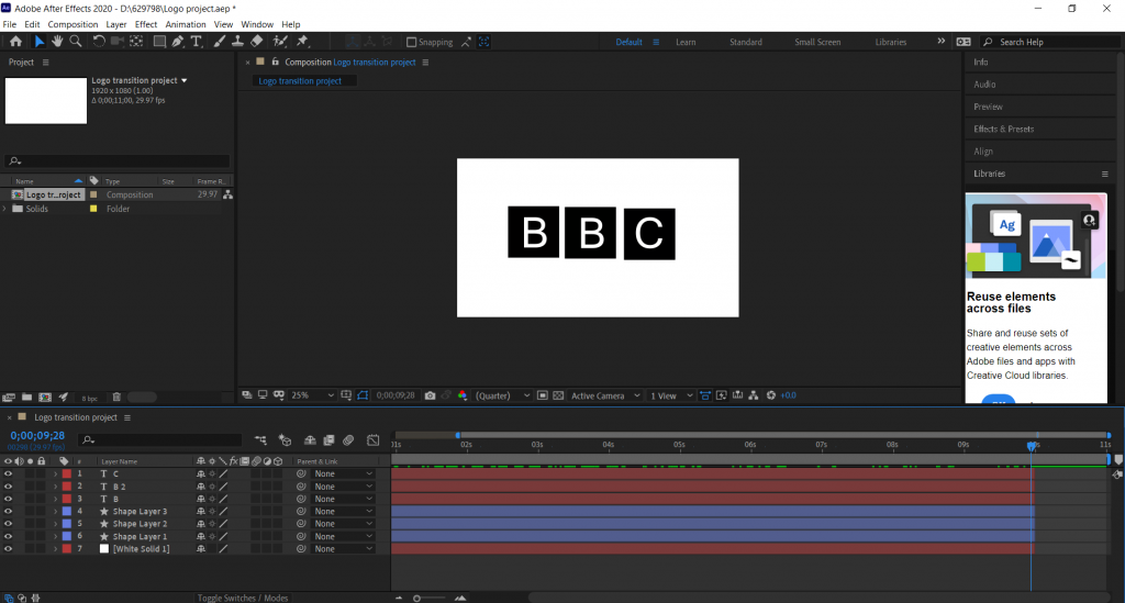 For this project, I created the BBC logo. I keyframes the position of the letters and the squares they go in so that they would move closer to the center of the screen. I also keyframed the color of the squares so that it would change as they got closer to the middle of the screen. The final thing I did is keyframe the transform of the objects so that they would move from 0% to 100% as they moved closer to the middle of the screen.