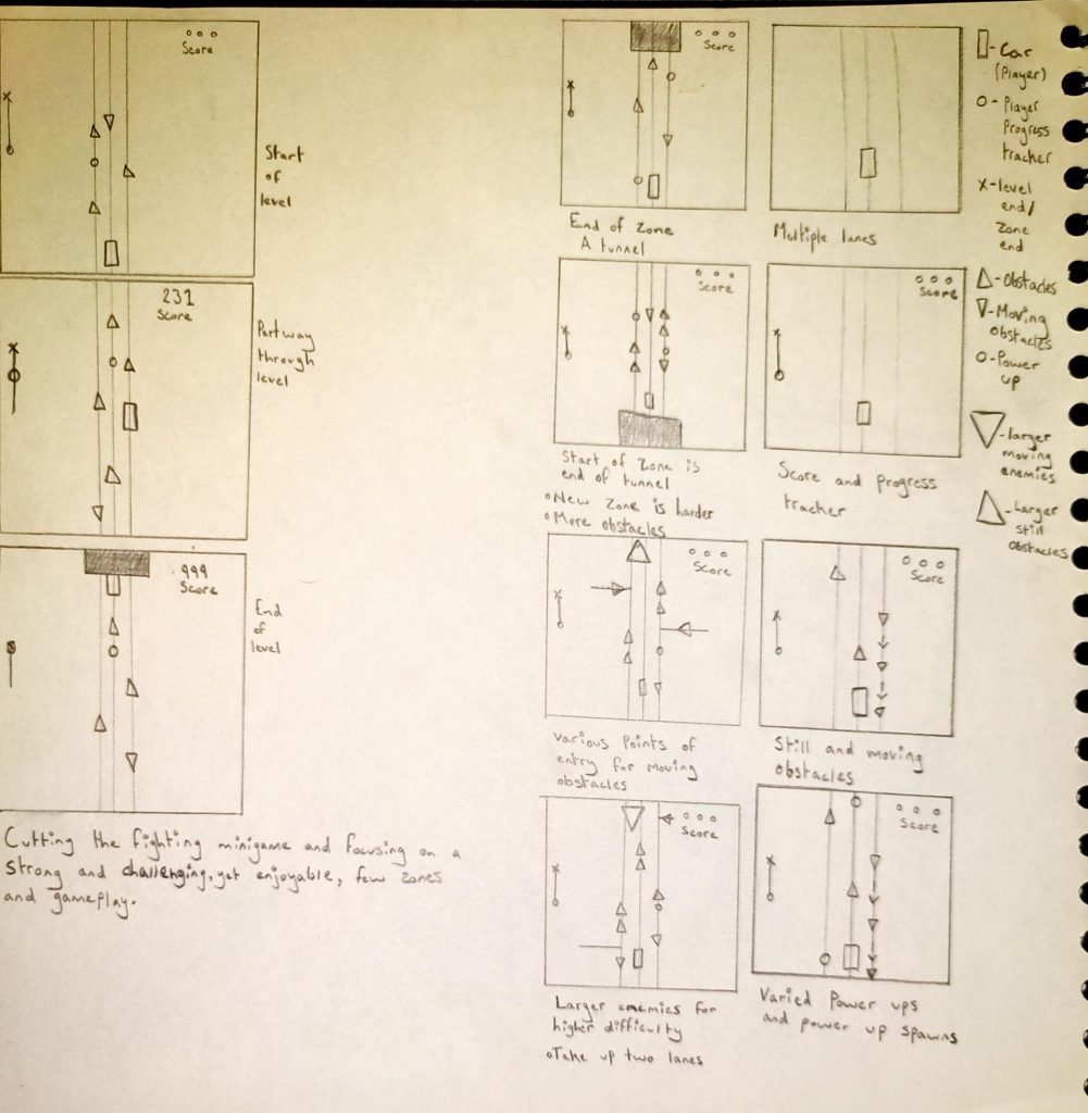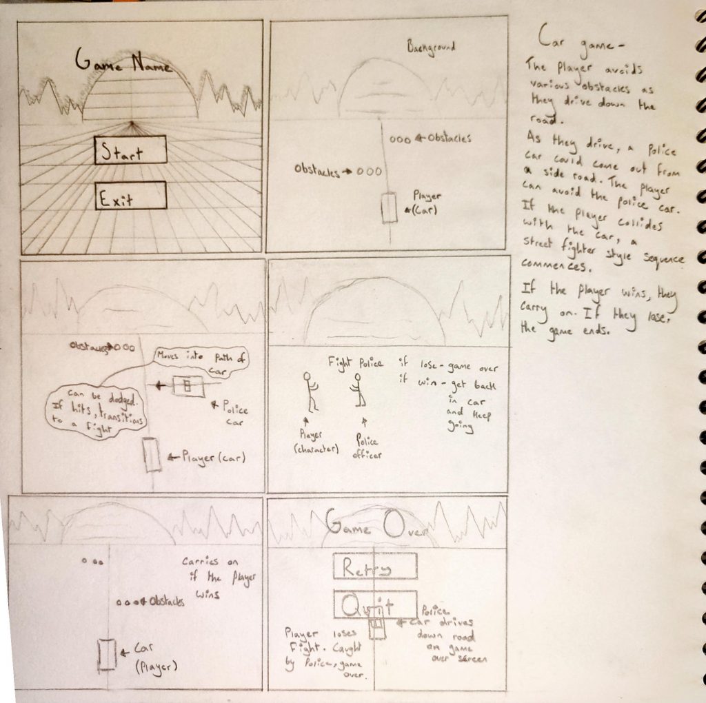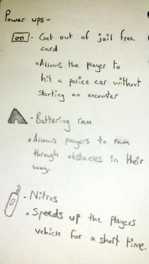 I drew a storyboard of the possible gameplay loop of the 2D car game. To the right of the storyboards, I have written a short description of the possible gameplay loops. In the gap between the description, I drew and wrote about some possible power ups for the game.