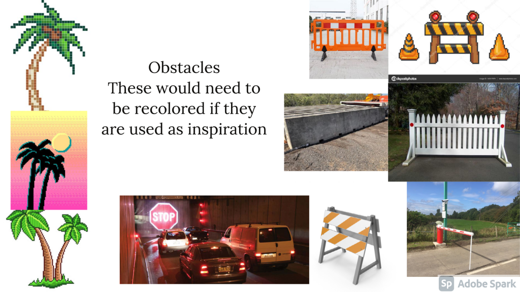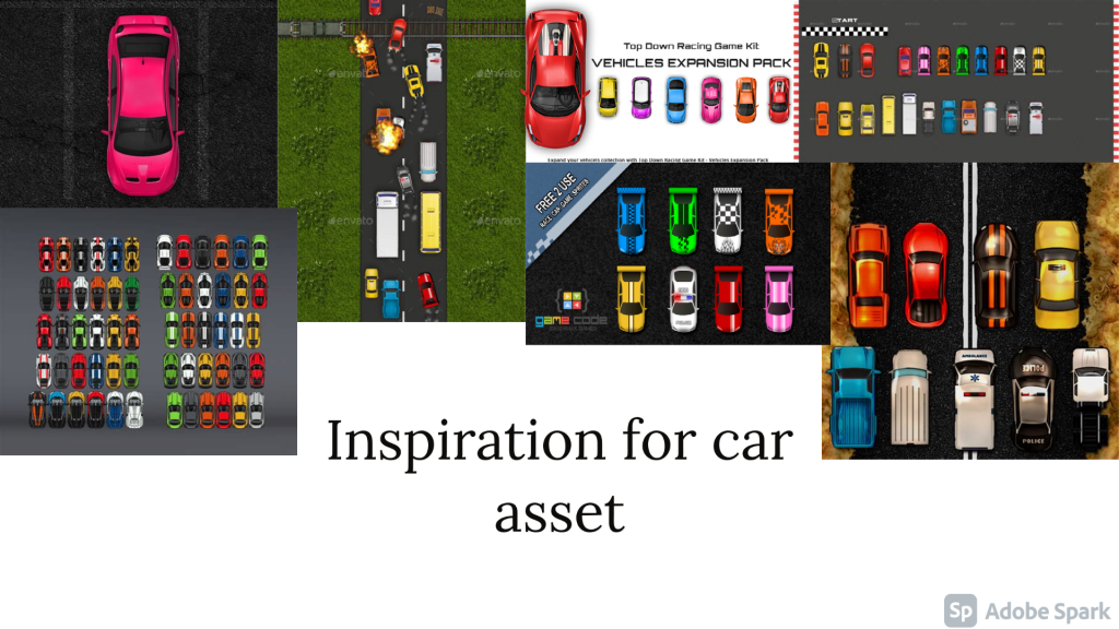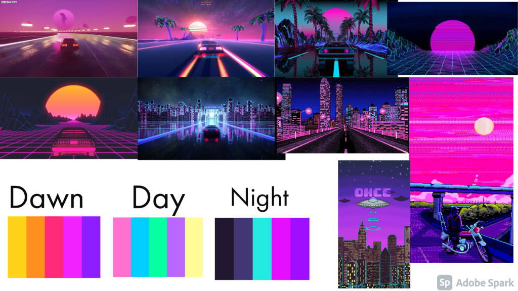 I wrote down the features of the prototype and the assets that would be needed to create it. I then created two mood boards. The first one shows various top-down cars that can be used a inspiration for the art team to create the player character. The second mood board is full of vapor wave images with vehicles in them. Vapor wave is going to be the primary theme of the game so it helps the art team with creating background and sprites. I also put various color palettes on so the art team could experiment with color variation. I have also made a mind map for the various obstacles that might be created for the game. I made a note saying that, if they are to used for inspiration, they would need to be recolored so that they fit the theme of the game.