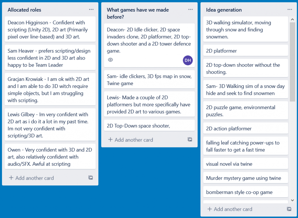 I created two tabs, allocated roles and what games have we made before?. Each team member wrote their strengths and weaknesses in the allocated roles section so that we could allocate roles based these. In the what games have we made before section, we wrote down the various games we had created before this project. I created this tab so that we could all get an idea of the kind of games we’ve made before. I wanted to know the kind of games my teammates had made so that, during idea generation, I’d know what kind of ideas I could put forward that would be possible to create in the time frame we have available to us.