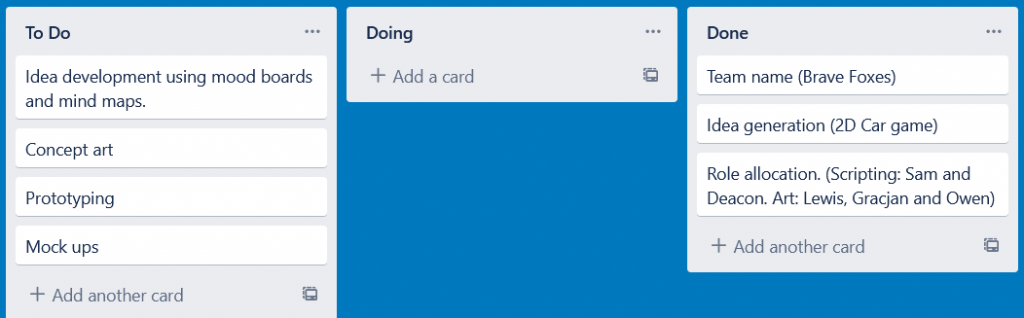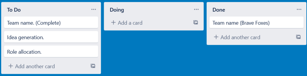 I created a Trello board and invited the members of the team to it so that we could brainstorm ideas and track progress throughout the module. I started putting various elements on the board so that we could track what we had to do. After putting forwards various ideas, we all decided on the name Brave Foxes.