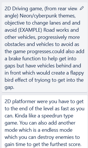 Two of the ideas put forwards were very advanced in their descriptions compared to the rest, going so far as to give examples of progressive game play and comparisons to similar games. Personally, I want to go forwards with the 2D driving game although we haven’t yet decided on the game we will be making.