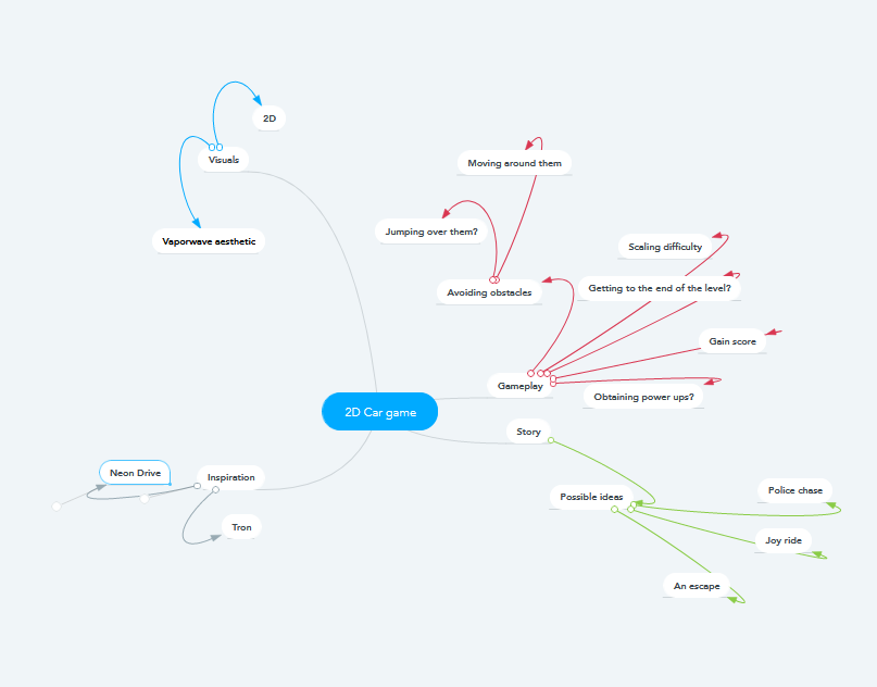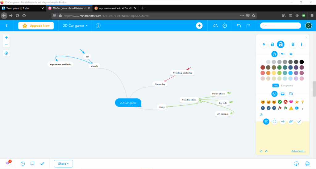 Last week, we decided on a game concept. We’re making a 2D driving game. To advance that idea, I have started a mind map. This mind map can be edited by everybody on my team so that we can all share ideas between each other.