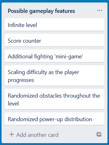 I added a tab to the Trello board that suggests various gamplay elements we had discussed a group.