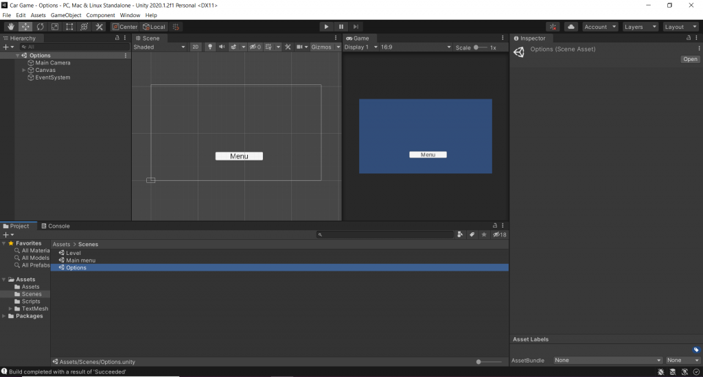 I removed the options menu and added the toggle audio button to the main menu. Having the options menu would have been a hassle for the player due to it only containing one options that is much easier to access on the main menu itself.
