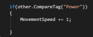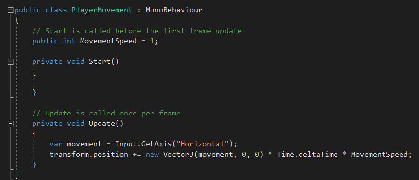 The first script I wrote was the player movement script. This script allows the player to move on the horizontal axis by using either the left and right arrows keys or A and D. The player speed is set to 1 but, due to being a public int, it can be changed outside of the script.
