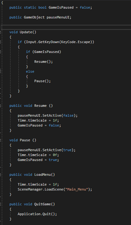 The second element is scripted was the pause menu. This script allows the player to press the escape key and pause the game. This script allows the game to be paused with a press of the escape key by initially setting GameIsPaused to false. Then stating that if the player presses the escape key while GameIsPaused is false then the Pause function will run. This function activates a hidden pause menu UI by setting the state of pauseMenuUI to true and pauses the game by setting the time scale to 0. When the pause menu is open there are three buttons; these buttons are the resume button, the menu button and the quit button. The resume button deactivates the pauseMenuUI and sets the time scale back to 1 reversing the effects of the Pause function. The menu button loads the main menu scene and sets the time scale back to 1 so that the game isn’t paused if the player presses play again. The quit button will quit the application completely.