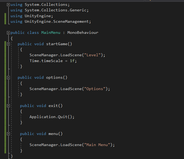 The third element I scripted was the main menu and the pause menu. I used the SceneManager.LoadScene line in each function of the script as it allows the button the script is linked to to load the specified scene. I made four scene loading functions in this script, start, options, menu and quit. These each allow the player to load a different scene of the game or quit altogether.