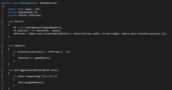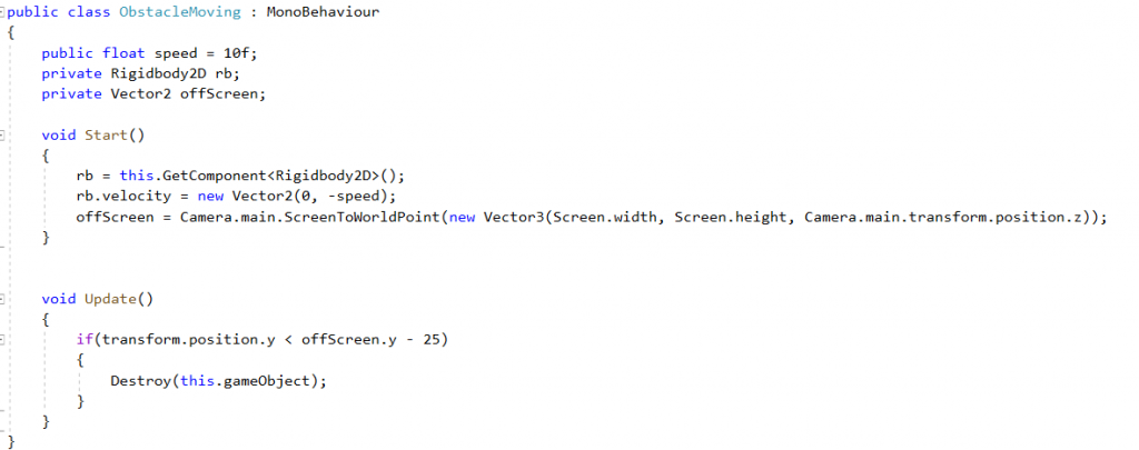 This script allows the obstacle to move down the screen then be destroyed once off screen. The script causes the obstacle to move at a speed of 10 down the Y axis and then, once of screen, it will be destroyed.