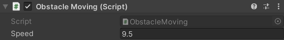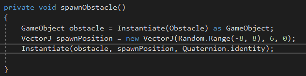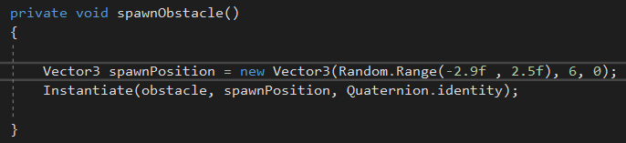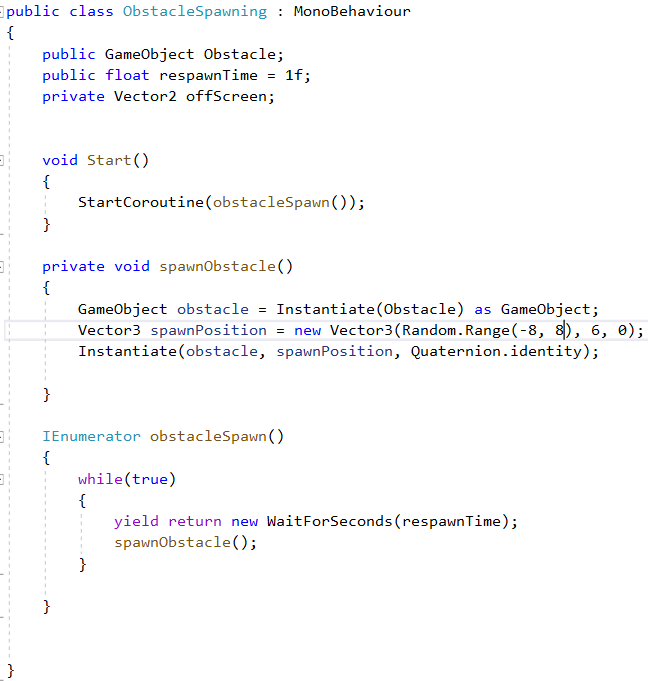 This script allows the obstacles to respawn at a given interval. It will respawn the obstacle at a random point on the X axis at point 6 on the Y axis.