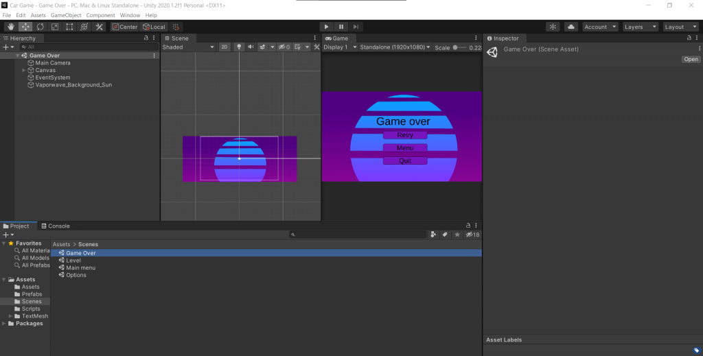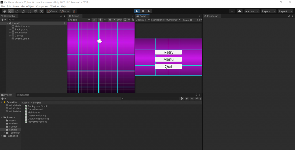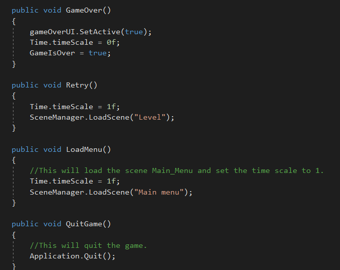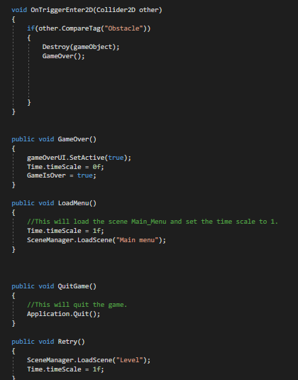 I have created a game over scene as when the game ended, escape could be clicked to resume the game and continue building points. The script for the game over menu is exactly the same as the pause menu bar the retry button being new. This button loads the level one scene.