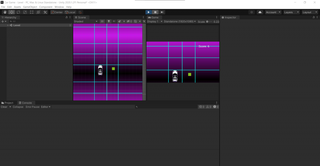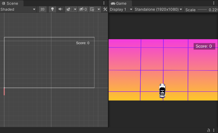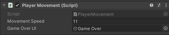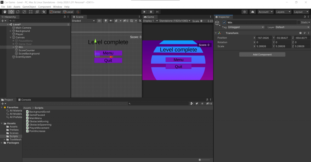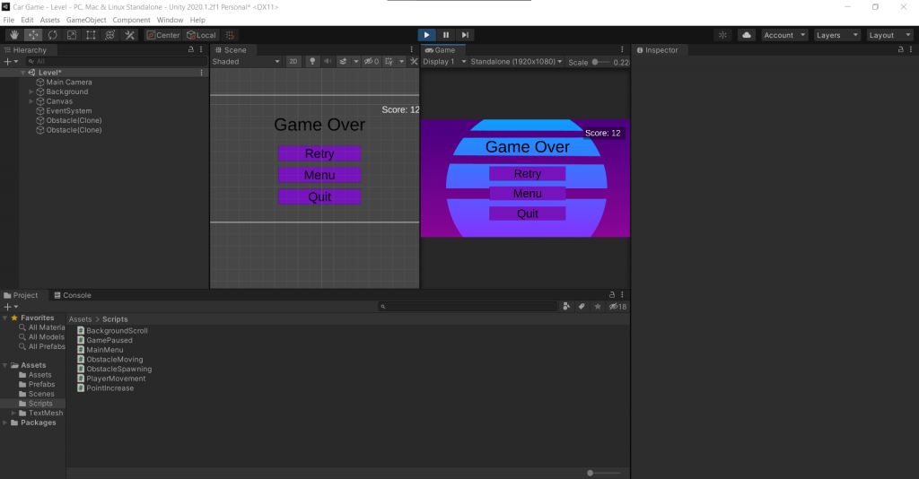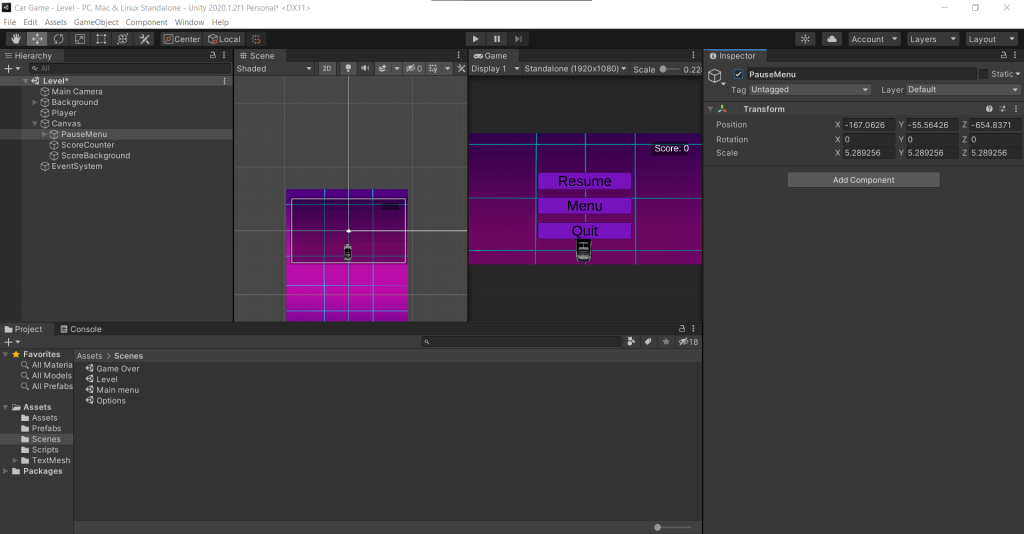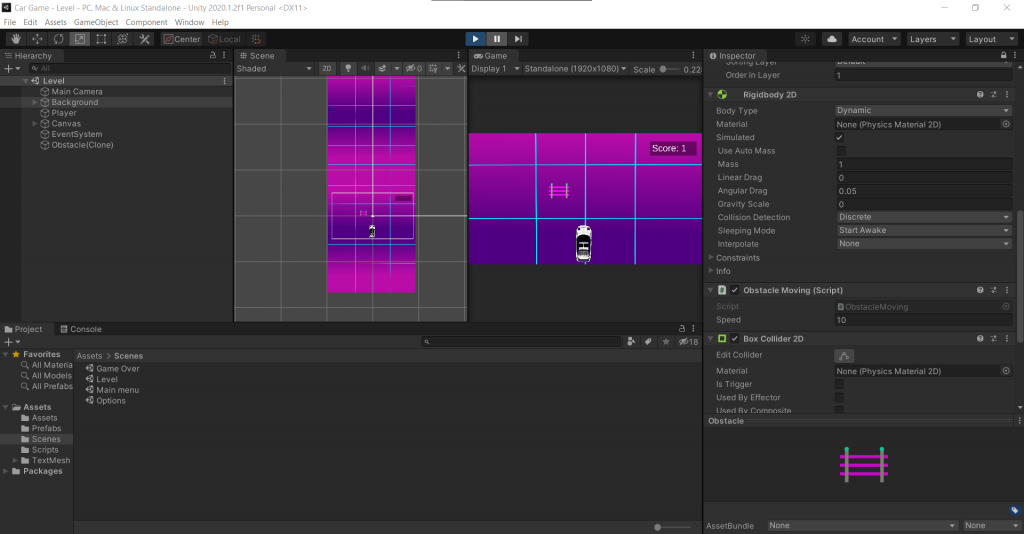 The script is set to initially set the game over UI as false so that it won’t appear when the level is loaded. When the car collides with an obstacle, the UI is set to true and the time scale is set to 0 so that the point count doesn’t keep going up.