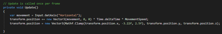 I added a new line to Update in the player movement script. This line uses Clamp to restrict player movement between two given points on the screen.