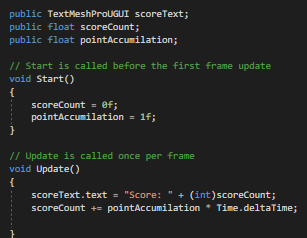 This script both causes the accumulation and display of points. It causes the build up of points by adding one every second. It displays the text with the amount of points added to the end of Score:. I had to use TextMeshProUGUI as I used TextMeshPro for the score counter text.