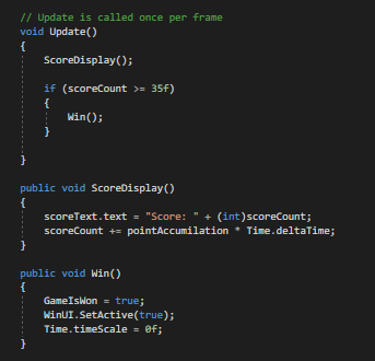 The script for winning is similar to that of pausing and losing. The UI is initially set to false so that it doesn’t appear on loading the level. It will appear once the player has reached 35 points.