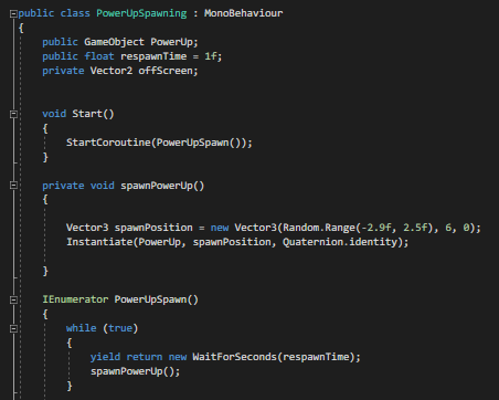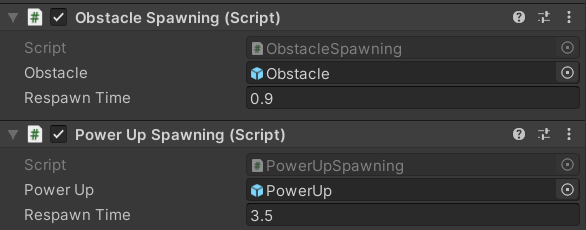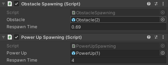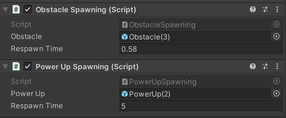 I have also changed the values for the respawn time of the obstacles and the respawn time for the power ups so that they are more difficult than the last.