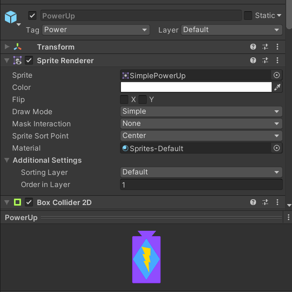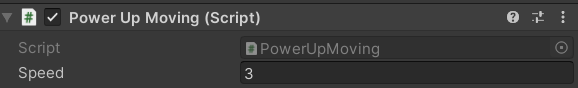 I have added a power up to the game. This power up increases the speed of the player by one. I used the same script written for obstacle spawning and moving for the spawning and movement of the power ups, though I have edited the values so that they move and spawn at different speeds. The power up is destroyed when it collides with the player and increases the movement speed by 1.