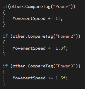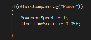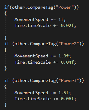 I have altered the effect of the power ups. When the player collides with them, the time scale is now increased slightly. When playing, I found that increasing player movement speed hardly benefit the player. I tried experimenting with various effects and found that the power ups often became more of an easy win than an assist. To scale down the over powered nature of the power ups, I have made them increase the speed of the player and the obstacles as well. Each power up collected will slightly increase the time scale, therefore increasing the speed of the obstacles as well.