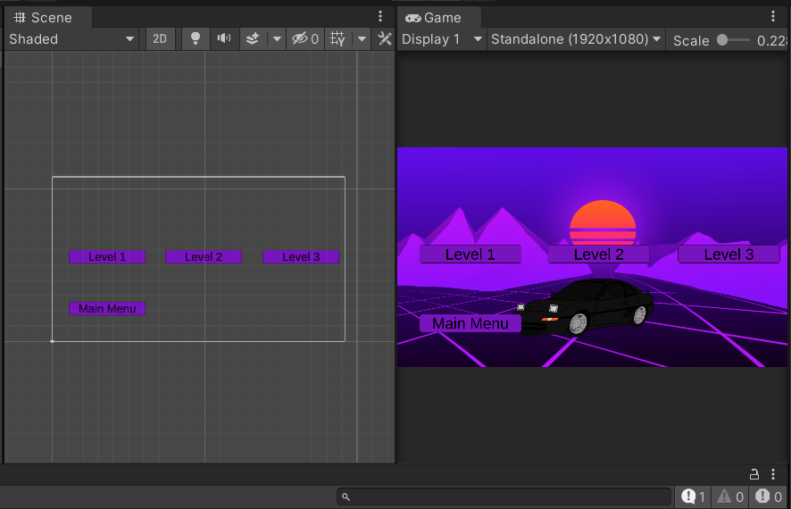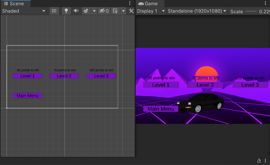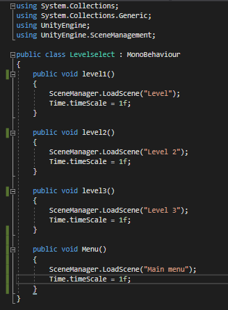 I used the same scene management I used for other menu buttons to make the buttons on the level selections menu take the player to each individual level.