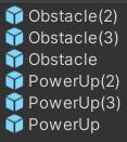 I have also created individual prefabs for the obstacles and upgrades due to needing to tweak individual values for each so that each level can be tuned differently.
