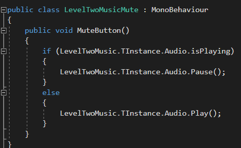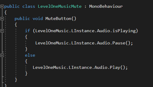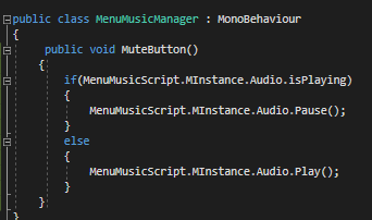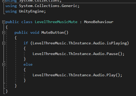 This script controls the mute button. It states that if the music is playing and the button is clicked, it will pause it. If it isn’t playing when it is clicked, it will start playing it again.