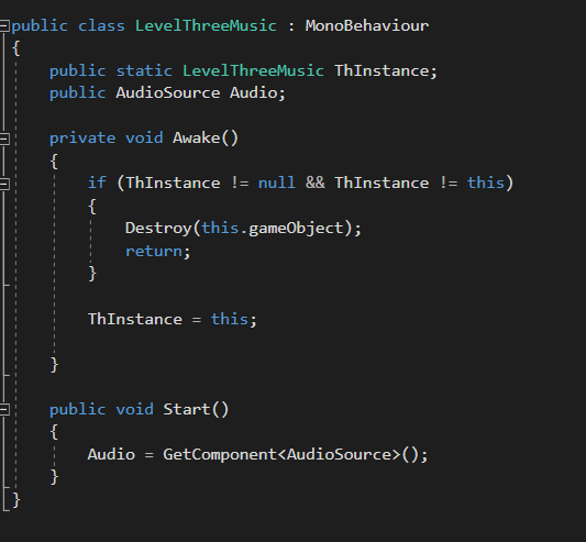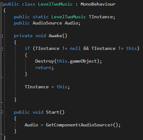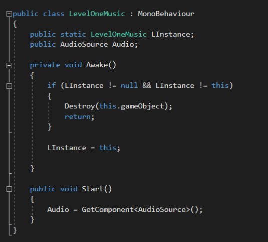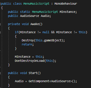 I have removed the DontDestroyOnLoad(This) line so that the music stays within the level and doesn’t continue playing when the player returns to the main menu.