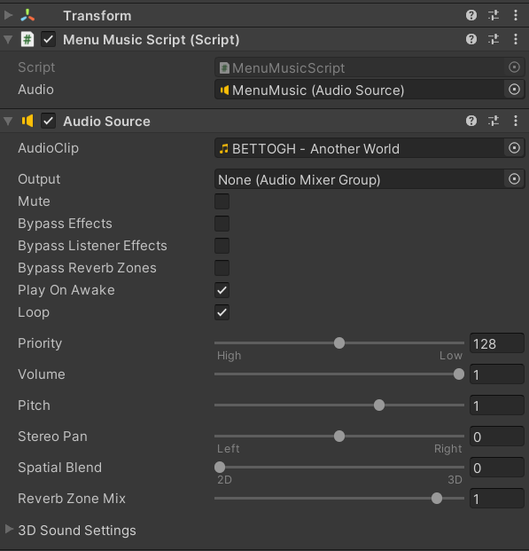 Also, I have added the background music for all three levels. This music is specific to the level and can be muted through the pause menu. The scripts used are adaptations of the main menu music and main menu music manager scripts.