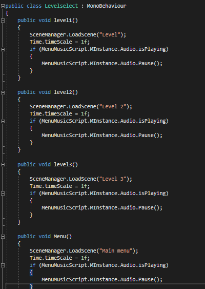 I have also edited the level selection script so that it pauses the main menu music when a level is chosen the music is muted. I have also made it so when the player returns to the main menu, the music is unmuted.