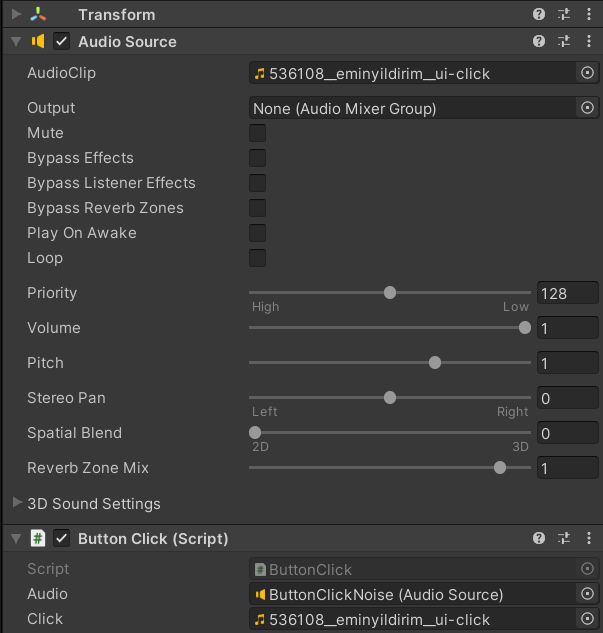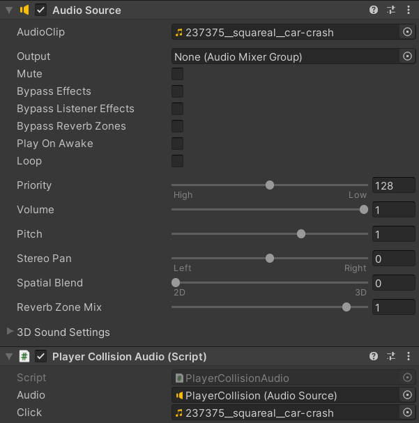For both the button click and player collision noises, I have turned off play on awake so that they will not play when the game is launched.