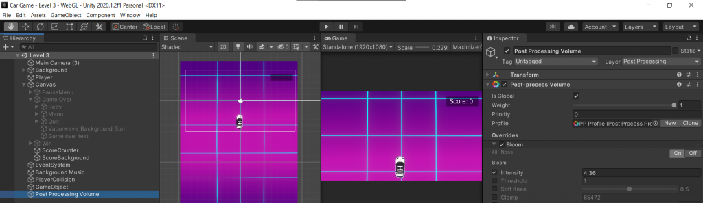 I have also added a slight bloom effect to each level through the use of post processing. I have added this due to it fitting with the outrun theme of the game.