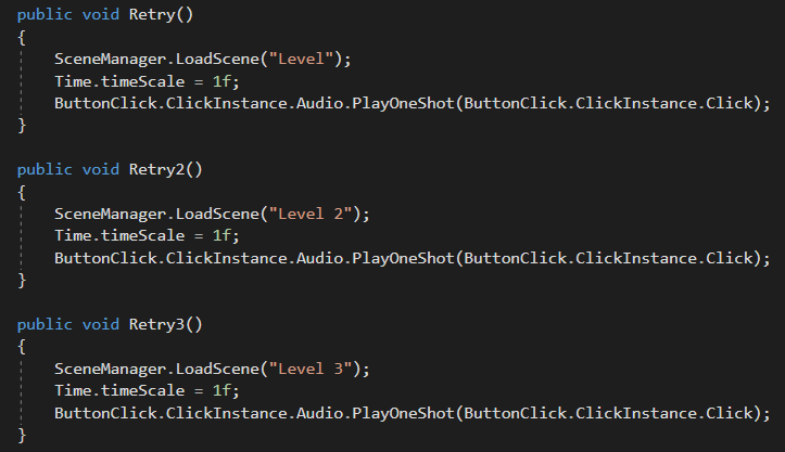 I have corrected an error with the retry button on the game over UI for each level. Prior to the fix, the retry button would send the player to the first level. I have correct this by adding two new retry functions for the two other levels.