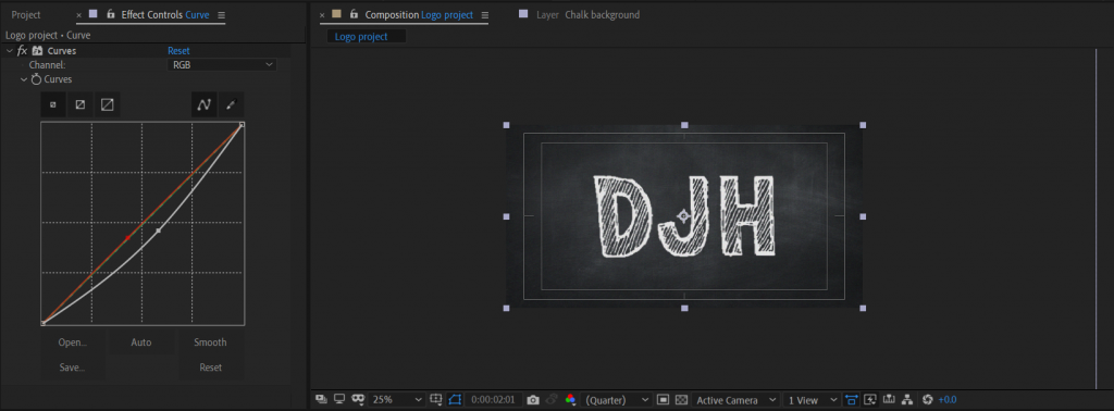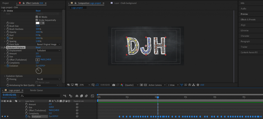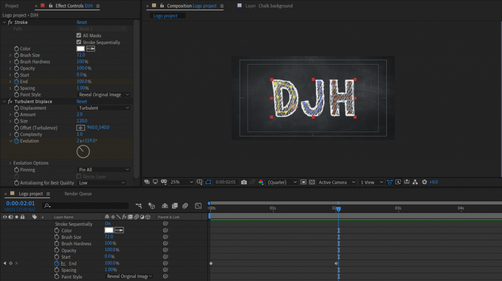 I have created an animation of my initials being written onto the screen. I drew over the text layer with the pen tool and used the stroke effect to make the text appear as if it was being written. I then added the turbulent displace effect so that the text would shuffle slightly to give it a bit more character. The two images below show the keyframing of the end of the stroke and the keyframing of the displacement.