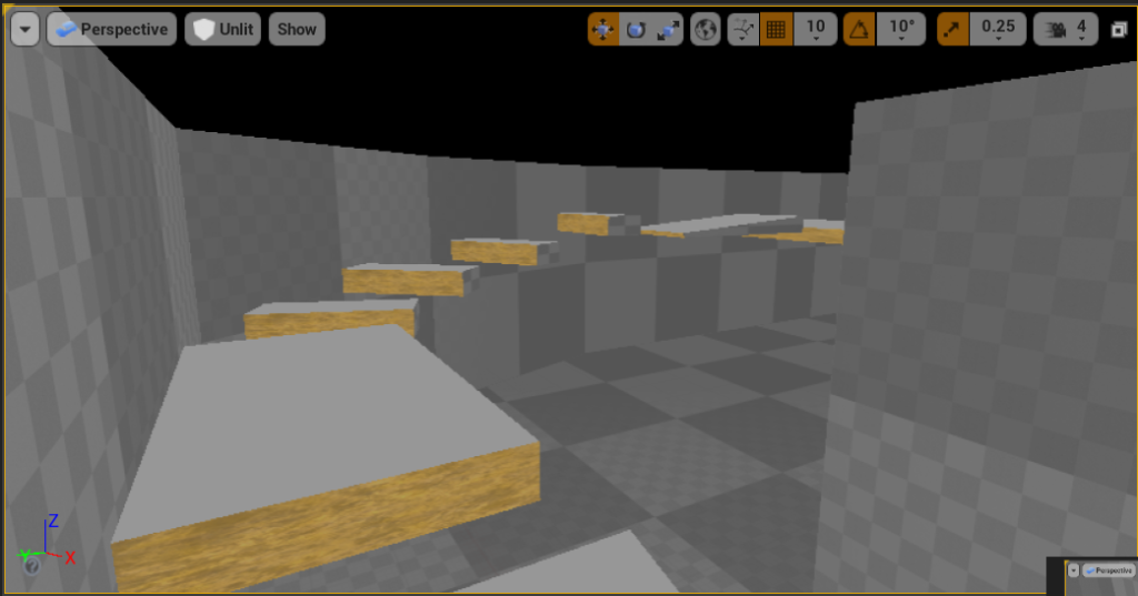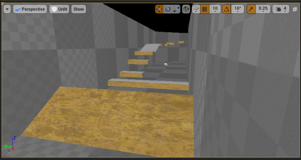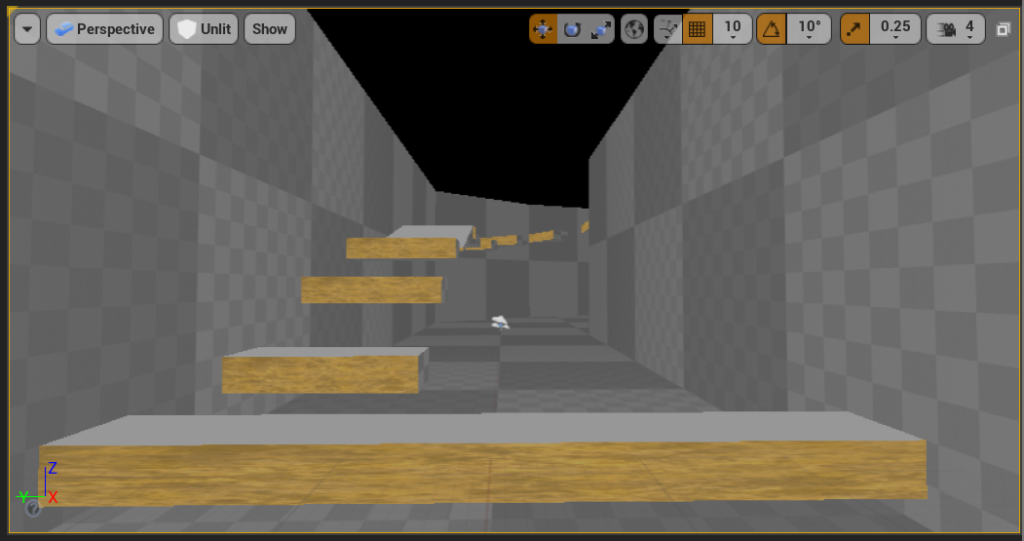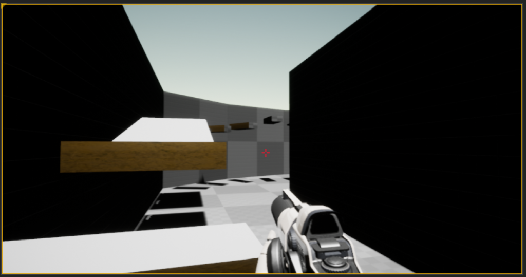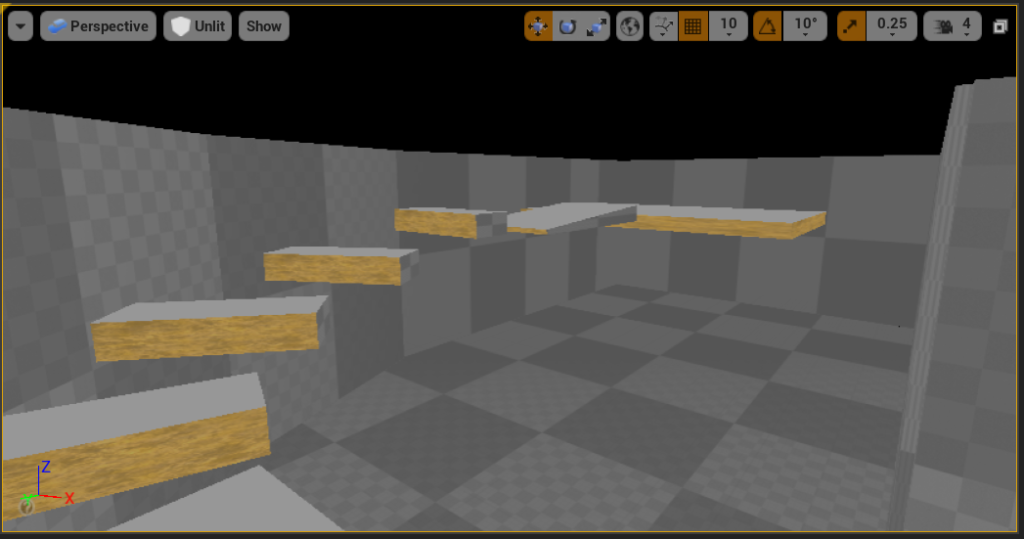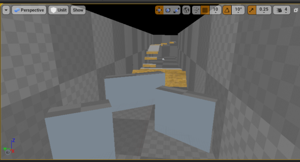 Using the Unreal engine, I have blocked out a small obstacle course level. The level curves as the player moves along as to avoid the boredom of a completely straight path.