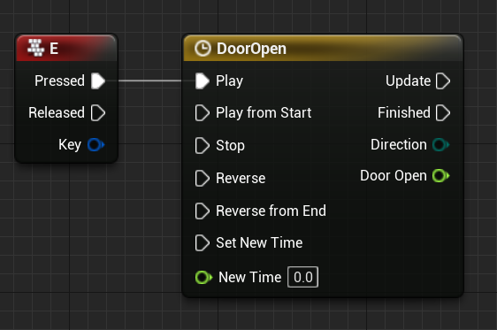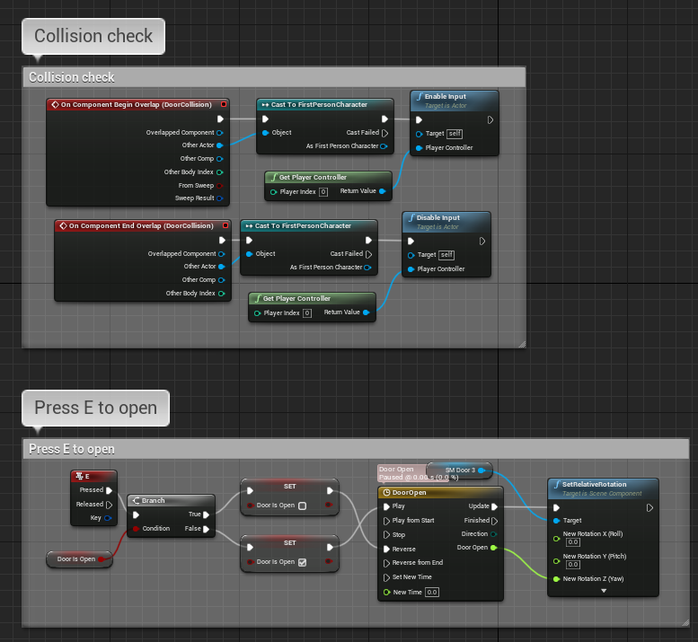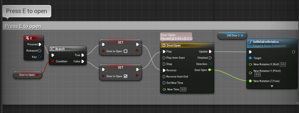 I then placed nodes that would cause the door, or close depending on the current state of the door, when the player pressed E.