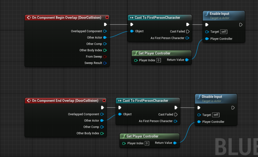 I then added nodes that would allow the player to interact with the door when in the radius of the box collider, I also stopped interaction when they left the radius.