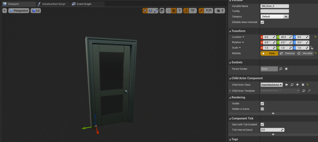 As a side note, I had a problem I still haven’t found a resolution for and I was pure luck that any of this worked in the first place. When I turn the door into a blueprint, the door model will spawn slightly in the frame if it isn’t static. It also provides an error message saying the door needs to be static. If I change the door to static, it spawns in the correct location but I get a new error. For the door to open it needs to be moveable but then I get the error of the door not being static. I will update the page when I find a solution to this.