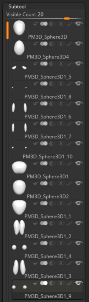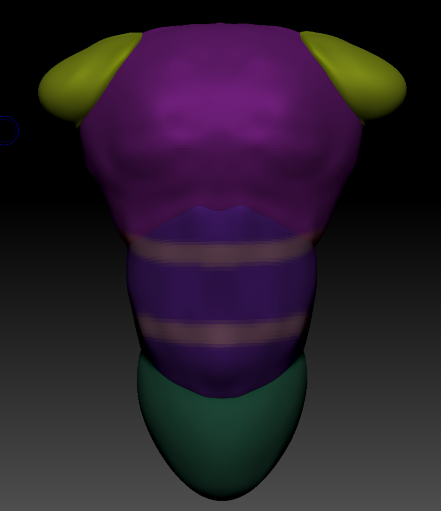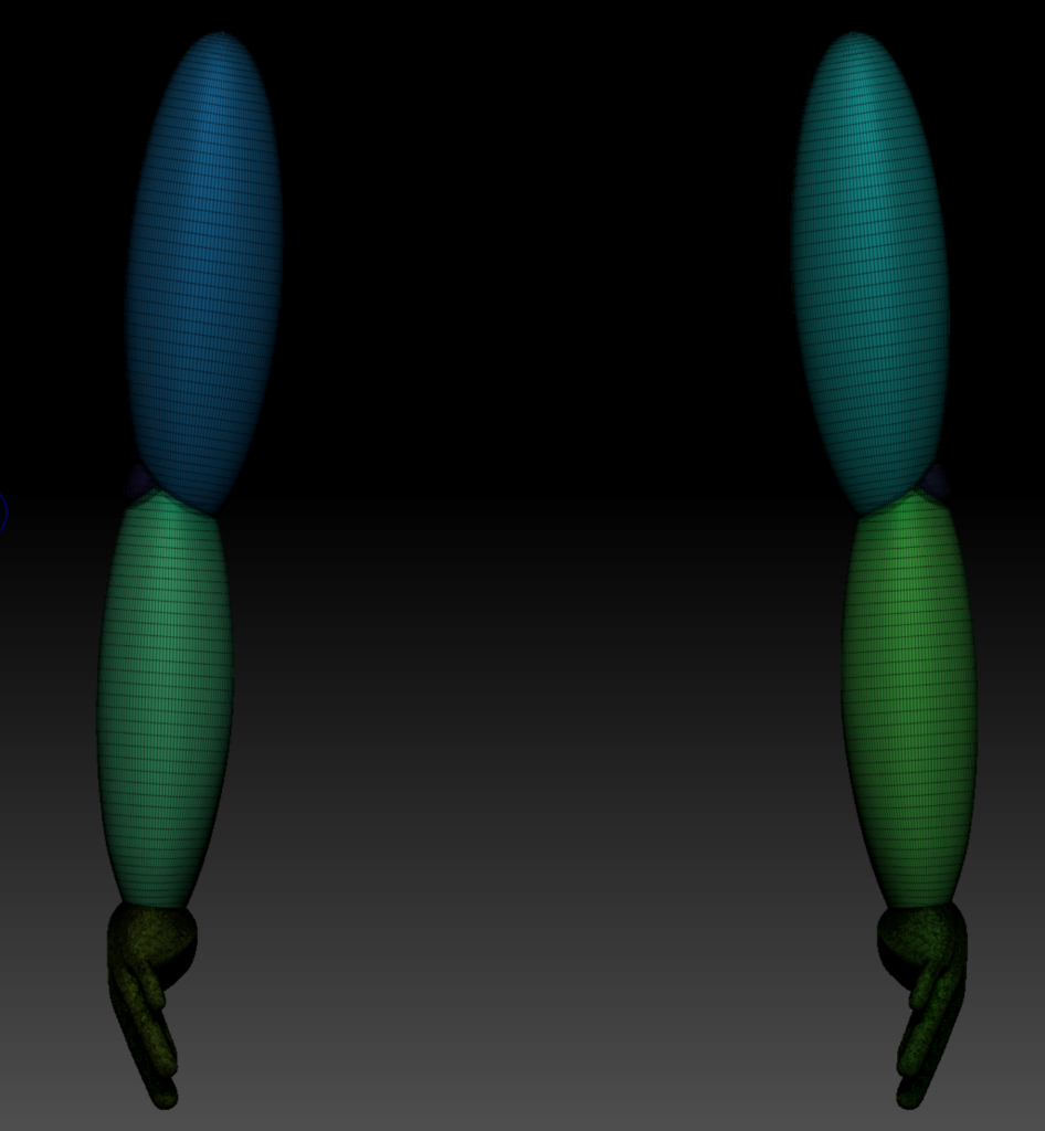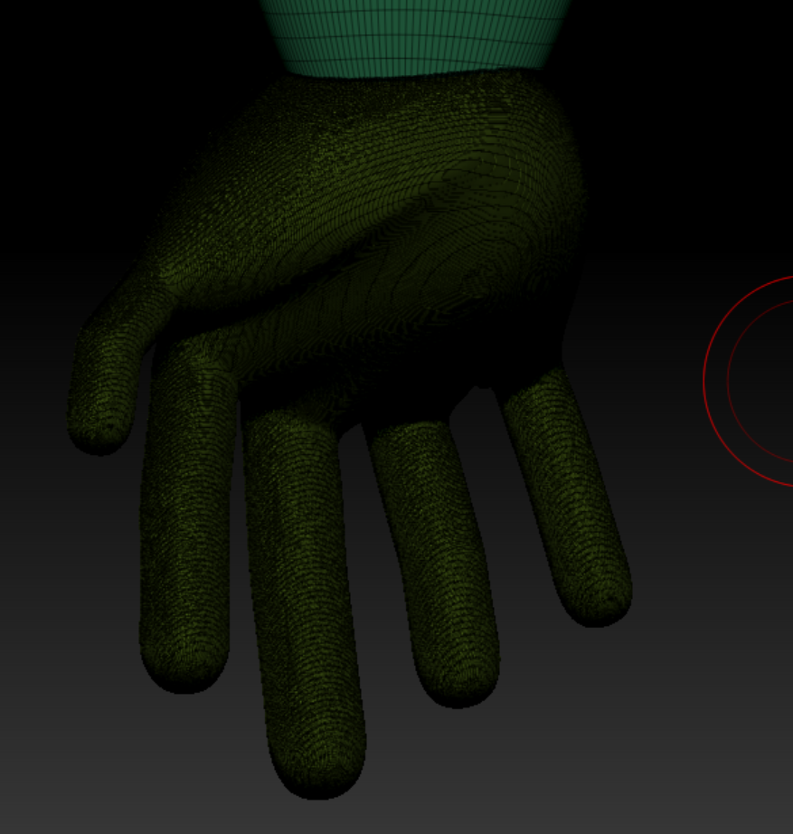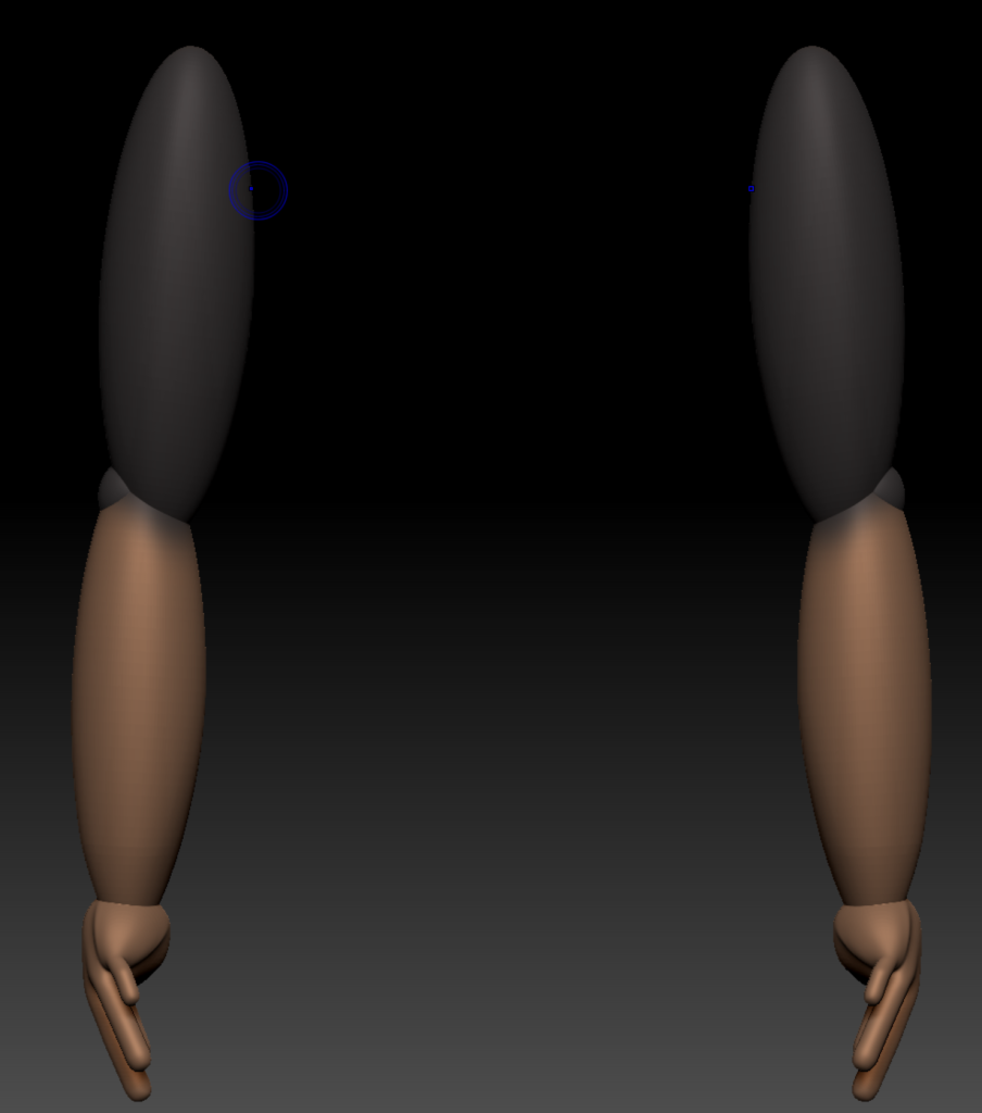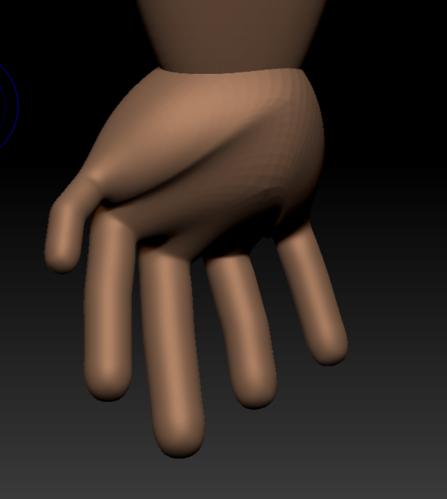 To create the hands, I used ZSpheres. To start, I used append to place a ZSphere into my scene. Once in, I moved the sphere to be at the base of the arm. On the sphere, I placed five smaller spheres. On these fives spheres I placed two spheres of equal size. To do this, I held shift while placing the spheres and it made them equal to the size of the sphere I was placing them on. These would be the fingers and thumb with three joints each. I then used the move tool to pull out the fingers and adjusted them to be off appropriate sizes. I also slightly adjusted the size of the sphere I first placed as it was far too big to be the palm of the hand. Once I was happy with the hands, I used adaptive skin to make them a solid mesh. I then used MakePolyMesh3D to make them an object. To have a hand on the other side I used mirror on x-axis. I then used polypaint to paint the hand the same color as the other shown skin.