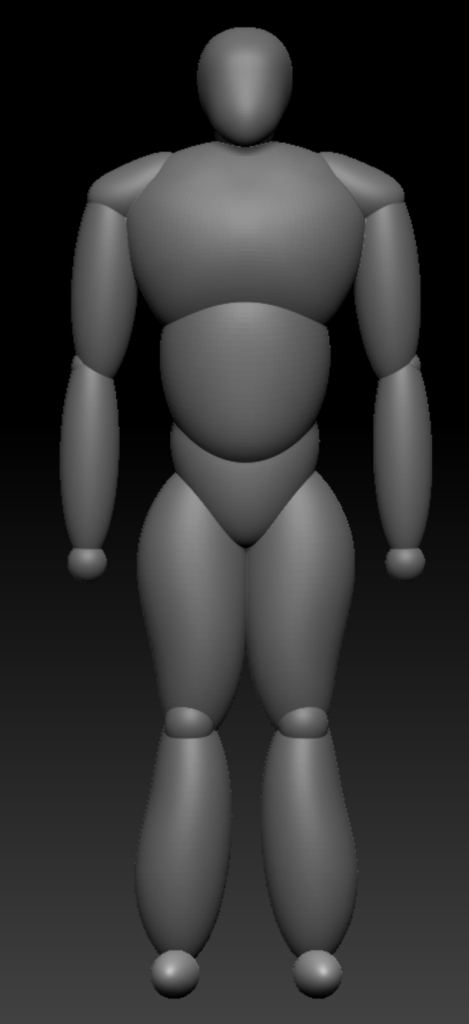 To start creating my character in ZBrush, I blocked out a simple outline of the body. To make sure this was accurate, I used a reference image of the human body. Following this as a guide, the first thing I did was create the mid section of the character using a sphere and the move brush. I then duplicated this and moved it upwards. I increased the size of the object and then used the move brush again to manipulate it into place. I then used append to place another sphere and put it below the midsection. I used the move brush to adjust it into a triangle like shape, this was the pelvis/crotch area. After this, I used append to create another sphere and made it longer on the y-axis. I then used the move brush to make it larger at the top and gradually get thinner as it moved down, this was to be the thigh. I placed it below the pelvis and used mirror on x-axis to mirror it to the other side. I then duplicated the object and turned it upside down. I placed it below the thigh as it was to be the calf. I again mirrored on x-axis. I then placed a small sphere between the two to be the knee, I slightly adjusted the object with the move brush and mirrored it. At the bottom of the calf, I placed a small circle and pulled it out to be a foot, I then mirrored this also. Atop the chest, I place a circle and pulled it out slightly to the side pushed it down at the top to make a slope, this was a shoulder. I mirrored this to have it on the other side. I then used the same process as the legs to make the arms. To make the neck I placed a circle and increased its length on the y-axis. I then placed a larger circle on top and pulled it down slightly at the front to be the head.