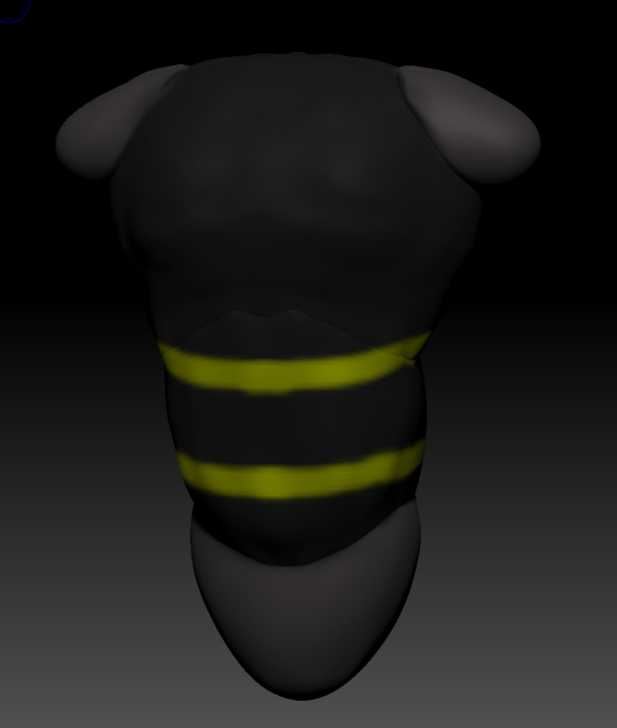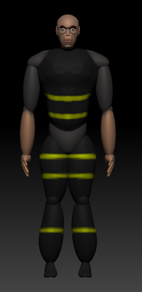 I used the clay build up brush to increase the size of the upper chest. I then smoothed over it. I then went to polypaint and chose a gray color, I colored the entire torso. This is the thermal shirt underneath the body armor the character wears. I then chose the chest and stomach section and hid the rest. I painted this black and added yellow striped. This is the body armor with high visibility strips on it.
