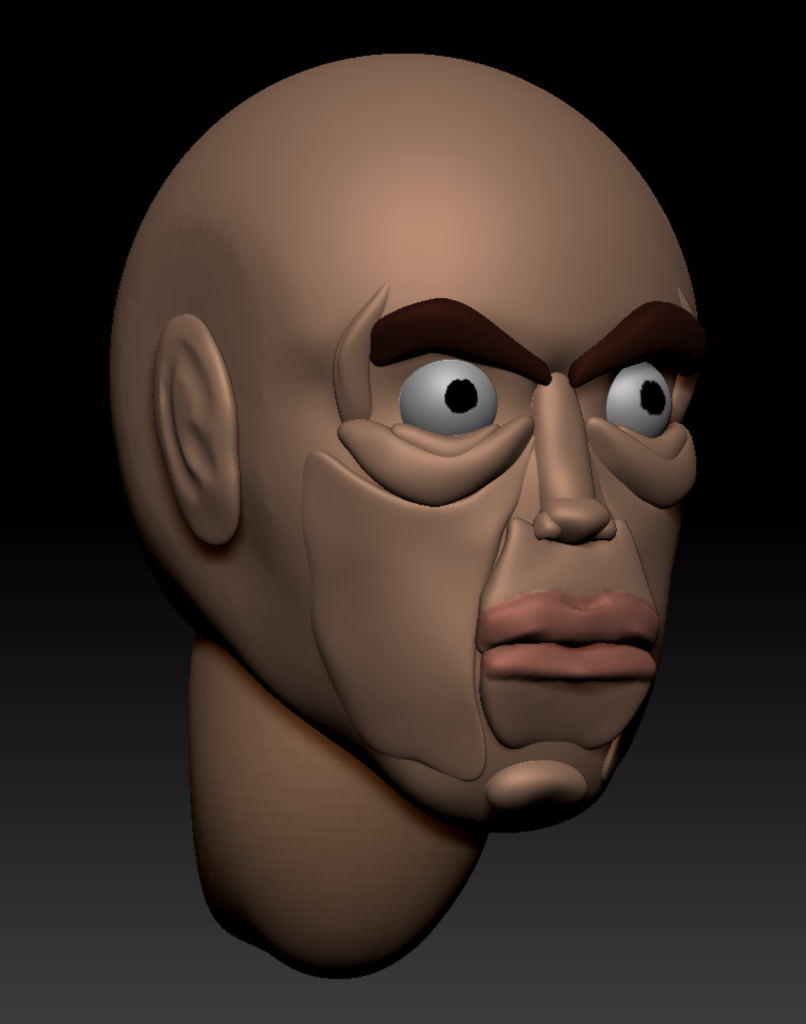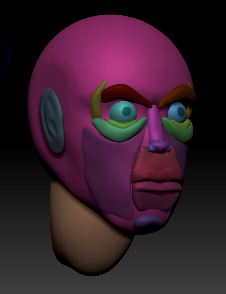 Once I had blocked out the body, I began working on the face. When making the face, I used reference of where the muscles of the face are located so I could get a realistic representation. In practice, this did not come through. To start I masked off a third of the head, leaving the front bottom section unmasked. I then used the move tool and pulled down on the unmasked area. This made the object look more like a skull. I then used the rectangular trim tool to cut off the sides of the head to give it a plane like an actual head would have. Following this, I used the dam standard brush to put a line through the skull right where I would want the eyes, this would be the representation of the brow line. I then used append to create another sphere and altered the shape of it and placed it in the center of the face, this would be the ridge of the nose. I placed another altered sphere at the bottom of this to act as the tip and two more on each side to be the nostrils. After I had finished the nose, I created the top of the cheek. I did this by creating a sphere, elongating it and then moving the ends with the move tool. To have this on both sides of the face, I used the mirror on x-axis function to mirror the object. I then duplicated and shrunk the object down and moved it up slightly to sit on top of the larger one. I then, again, duplicated the top of the cheek and flipped it upside down, this would be the eyebrows. Finally, I duplicated the object for a last time, rotated it and placed it on the side of the face for the temple. The next thing I did was append another sphere and placed it below the nose. I used the move tool to pull the corners into place and duplicated it. I then rotated the duplicated object to be upside down and slightly adjusted the edges , these were the upper and lower lips. After that I appended another sphere and stretched it across the side of the face to be the cheeks. I mirrored the object on the x-axis to have it on both sides. I then chose the clay build up brush and held alt to make the eye socket. I placed two appended spheres in these sockets. To make the lips pop out a bit more, I drew over them with clay build up and then smoothed them. I then appended another sphere and placed it below the lips, this would be the chin. Finally, I appended another sphere. I stretched this sphere on the y-axis, used clay build up with alt held to make an indent in the ear and smoothed it. I the went to the polypaint tab and turned on colorize. I turned off ZAdd so I wouldn’t be adding anything to the model and chose a color I liked for the skin. I then painted the entire head. After that I chose a brown color and hid all but the eyebrows so I could paint them without effecting the rest of the model. I then went back to the head, chose the eyes and hid the rest of the model. I painted them white and then put a black dot in the center to be the pupil. Finally, I painted a slightly pinker tone of the the lips. After I had completed the head, I raised it slightly as it was sitting too low on the neck. I also found that the neck was too large and the the scaling tool to reduce its size slightly.