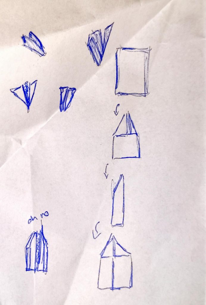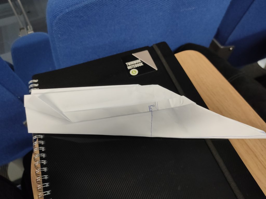 During the lecture, we were randomly assigned to groups of three. We were then given a piece of paper and told to fold it into four, in the four corners we wrote design, presentation, revision, presentation. In the first section, I wrote key things said during the lecture that I would base my design around. During this time, we worked individually, creating our own paper airplanes. On the back of this paper I drew plans for the first iteration of the paper airplane. It was a very basic and uninspired design. It was extremely wide and tall, when thrown it nosedived down to the floor. After throwing the airplane, and seeing it crash, I wrote down the events and believed cause in the presentation section so that, during the revision phase, I would be able to refer to them and design the plane to make up for the flaws.