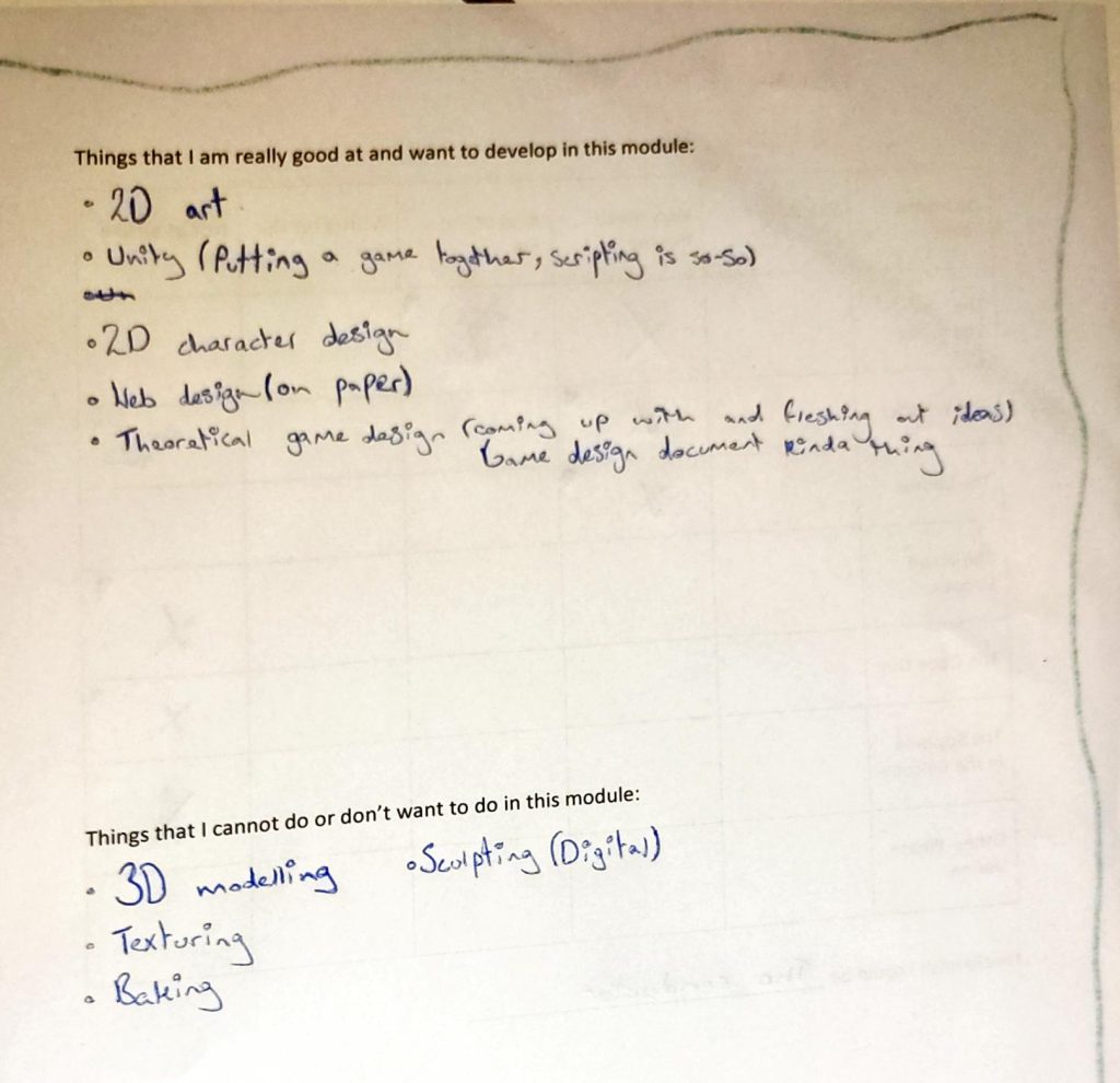 In the lab sessions, we sat opposite each other, moving clockwise every three minutes or so, introducing ourselves to each other and comparing what we had written on the sheets. There were individuals from both the Game Design and Digital Design courses so there were a diverse range of individuals with varying strengths and weaknesses and a range of different preferred roles. While talking to people, I found that close to nobody likes scripting but 2D and 3D work were equally liked. In the entire sessions, I only heard two people reference audio, something I hadn’t even thought about.