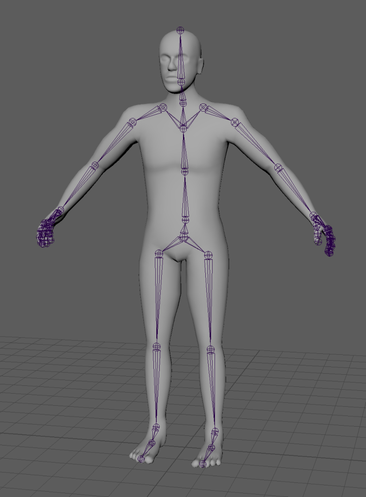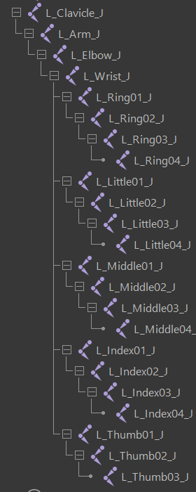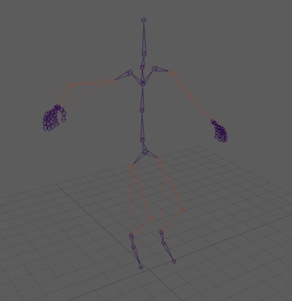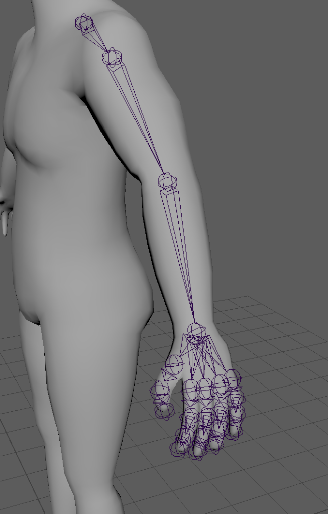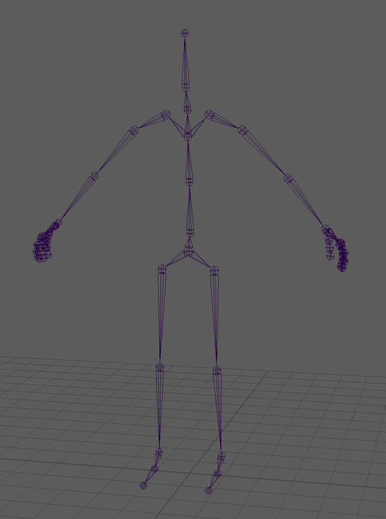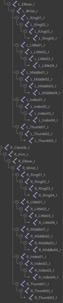 I then added joints all the way down the arm from the clavicle to the end of each finger. I named these the same way as the leg and then mirrored them.