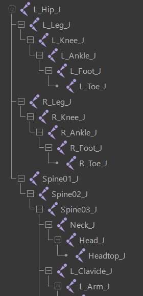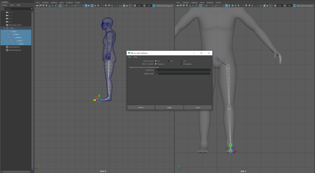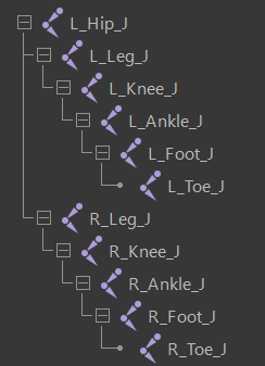 I named each joint, including an L_ before them so that it could be used a tag for mirroring. I then mirrored the hip leg joint.
