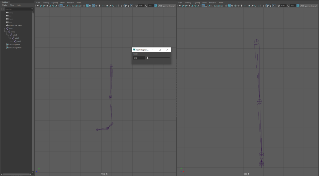 I started by adding joints from the toe to the top of the leg, with one join being placed above the crotch. I changed the size of the joints so that they would be easier to work with as they were too large before I had changed them.