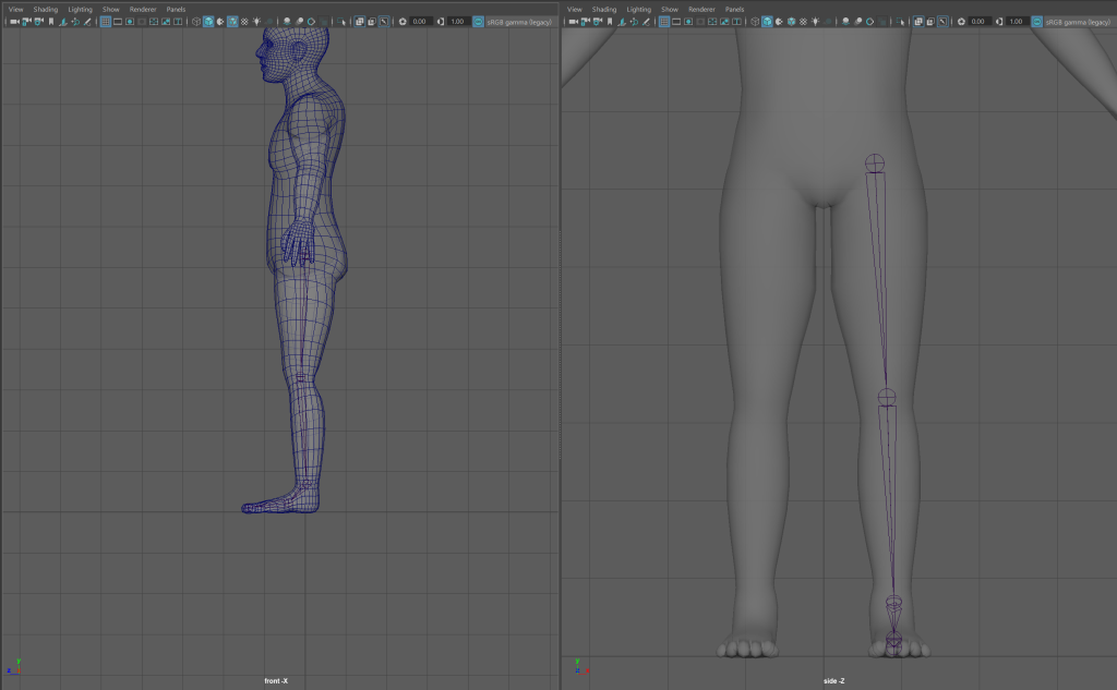 Once all joints were connected, I added IK handles to the arms and legs. I then used bind skin to attach the rig to the character.