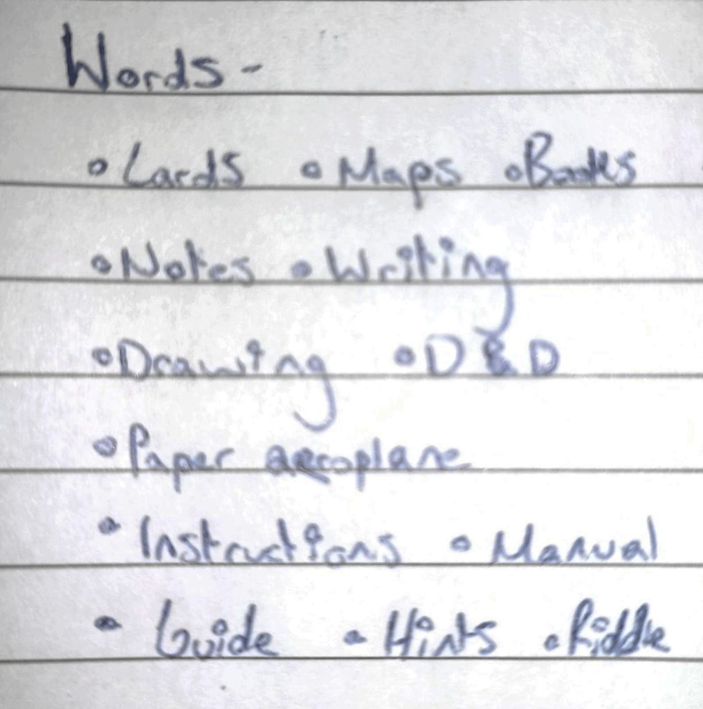 To start generating ideas for what I might make I wrote down words I thought of when hearing paper. There are far less than the last theme as I couldn’t come up with many.