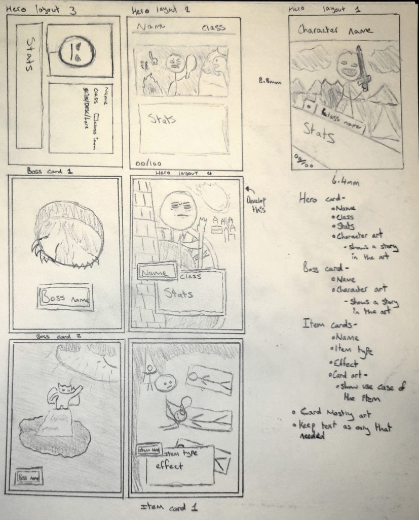 I started the development of the cards with the hero card. I drew various different layouts for the card, writing down the elements that would be on the card as I went. I landed on a layout that featured minimal text, focusing on the card art. I prefer this design to the other as there is more room to tell a story with the art by minimizing the amount of information present on the card to only that necessary.